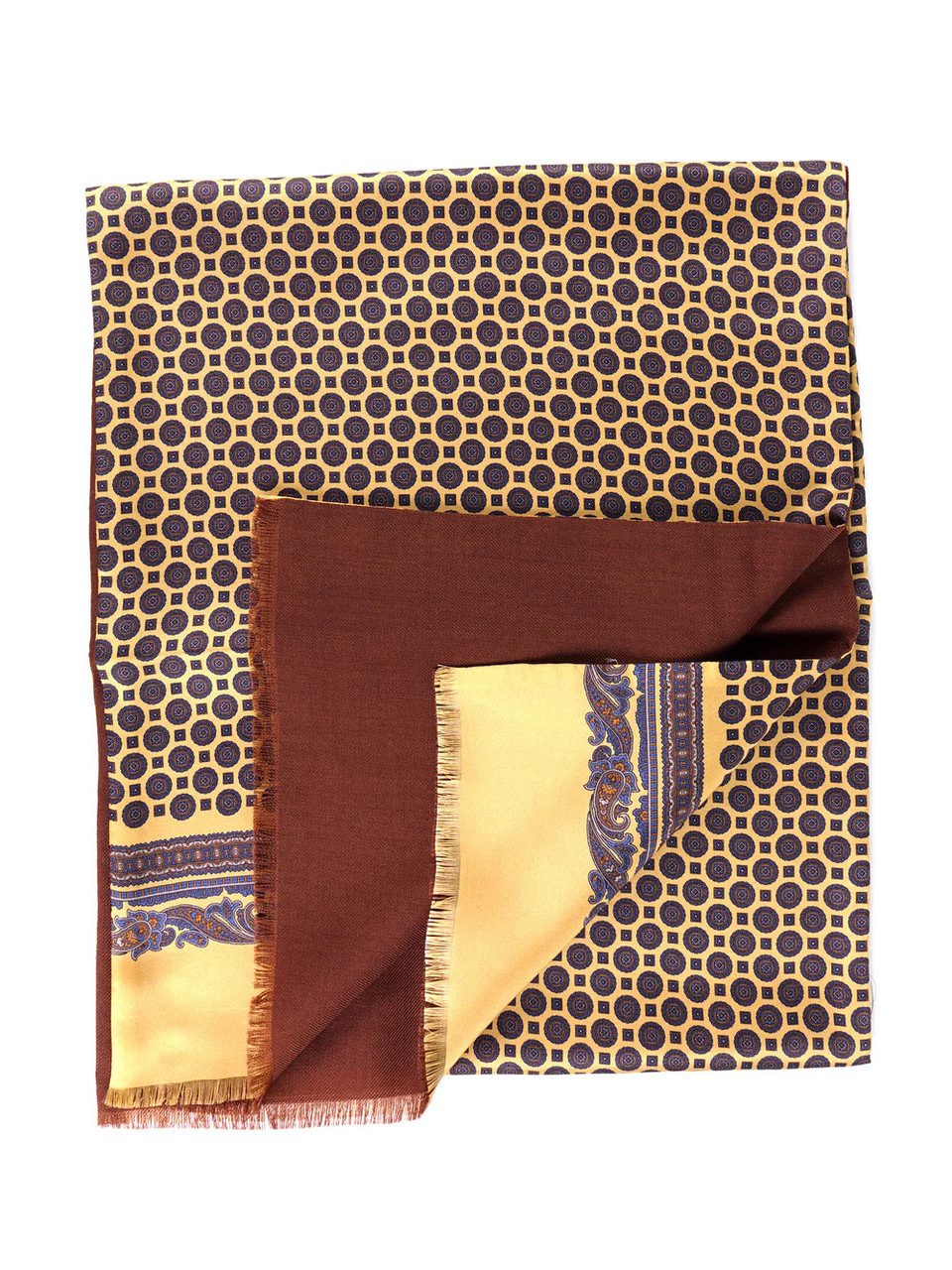 Cammeo new season,  Don Mimi luxurious 2 layer, printed silk and wool scarf. A classic scarf with detailed geo patterned, printed silk front with scroll border and contrast plain wool back. Luxury and style when cold but also light enough to wear all year round. Comes with a gift box.