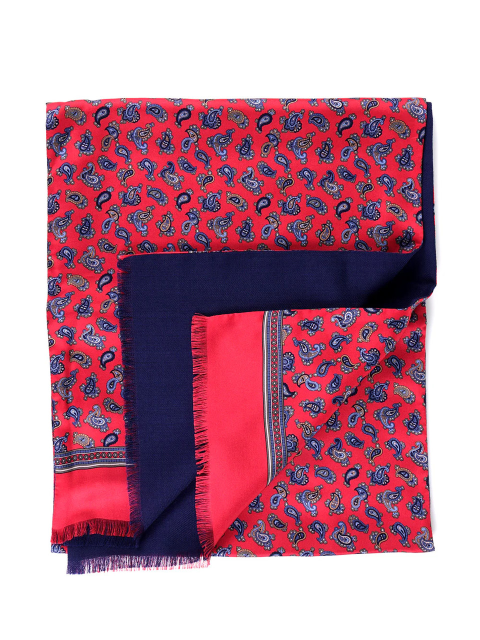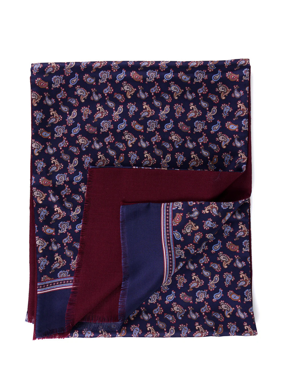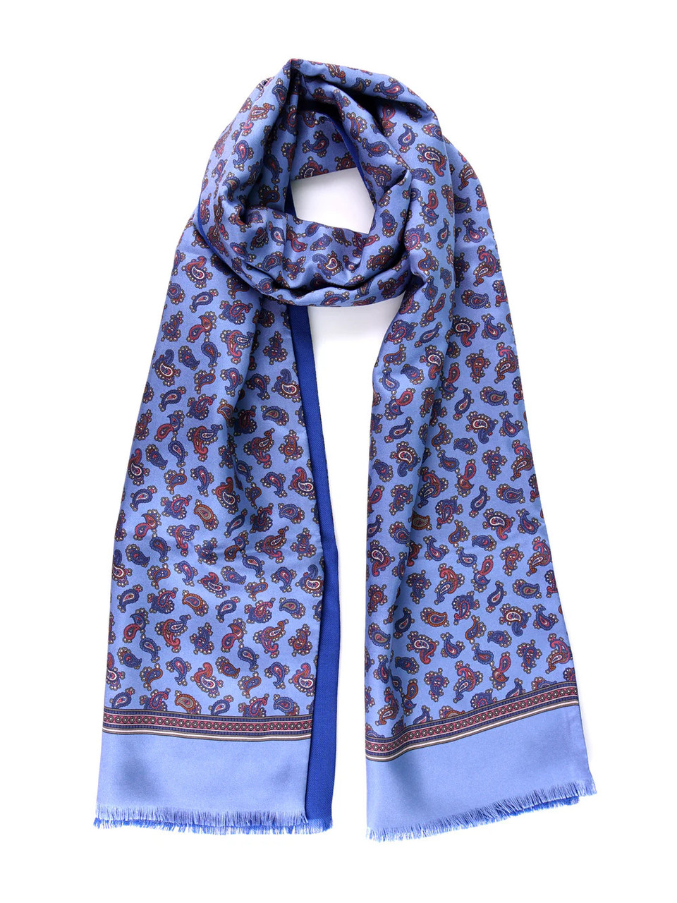 Don Mimi new season, Always, luxurious 2 layer, printed silk and wool scarf. A classic scarf with small paisley tear drop printed silk front with plain block colour border and contrast plain wool back. Luxury and style when cooler but also light enough to wear all year round. Comes with a gift box.