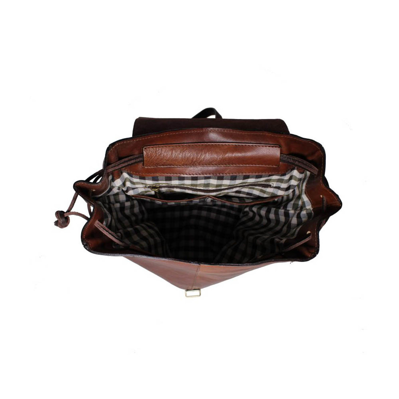A classic backpack made in fabulous quality grained, Italian leather. it has a single top handle with 2 adjustable cross over shoulder straps and the leather flap over that secures with a single metal magnetic button. The rear has a zipped pocket, 2 side pouches. The leather drawstring closure opens to reveal check lined interior with size zip compartment and 2 pouches.
