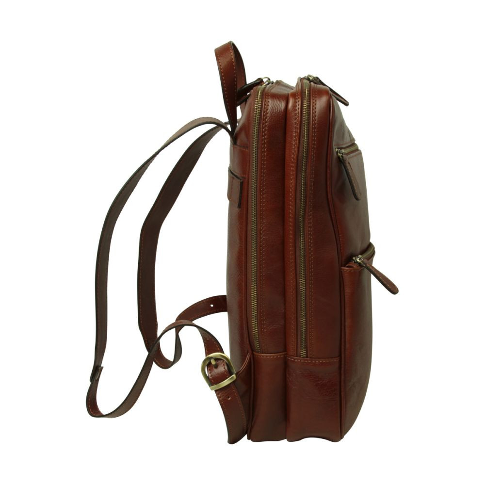 Functional unisex rucksack bag, handcrafted in Florentine Italian leather. It has a single top handle with 2 cross over, adjustable canvas and leather shoulder straps and fabric back. There is a front external zipped pouch and separate zipped compartment. There are 2 main spacious zipped compartments which are cloth lined with both zipped and open pockets.