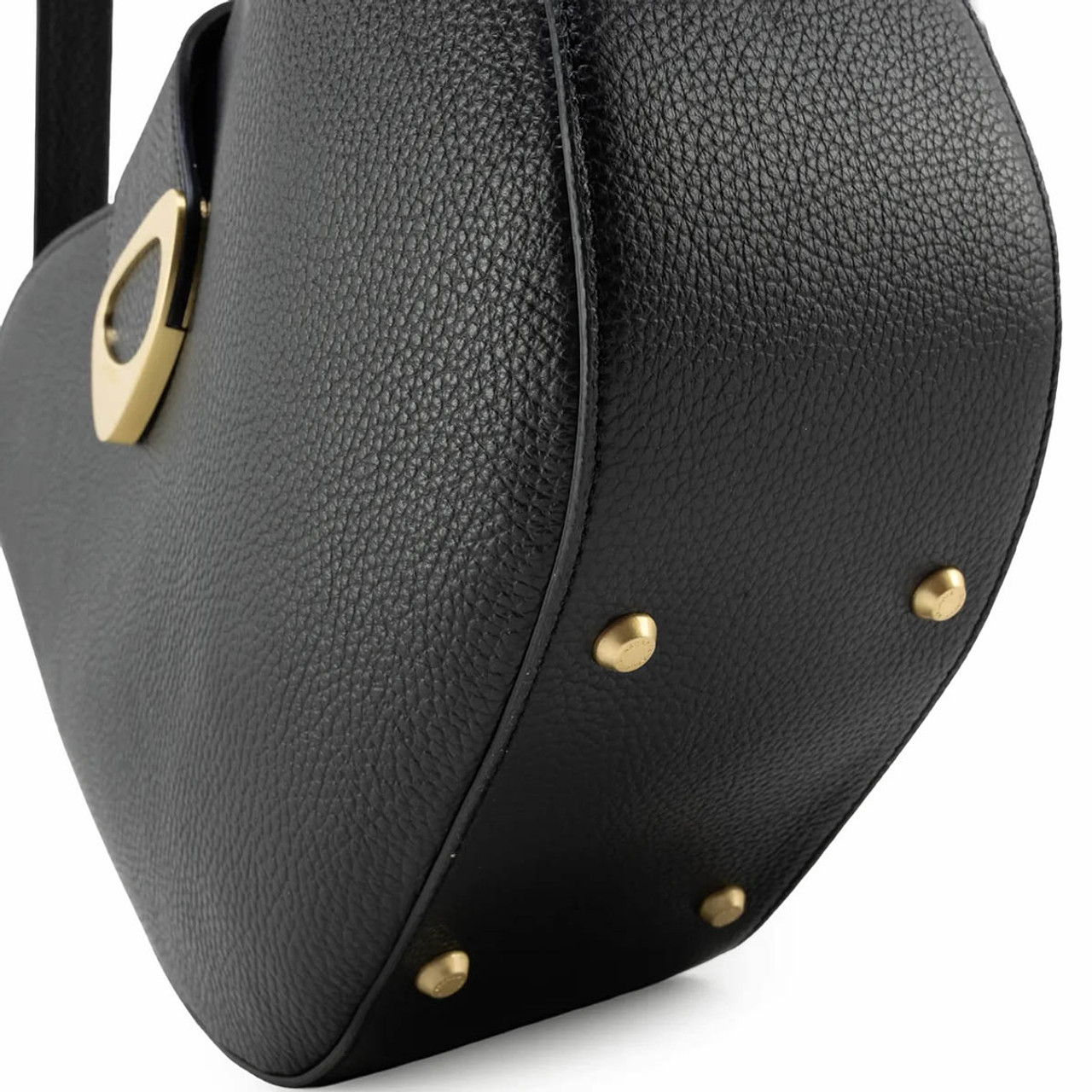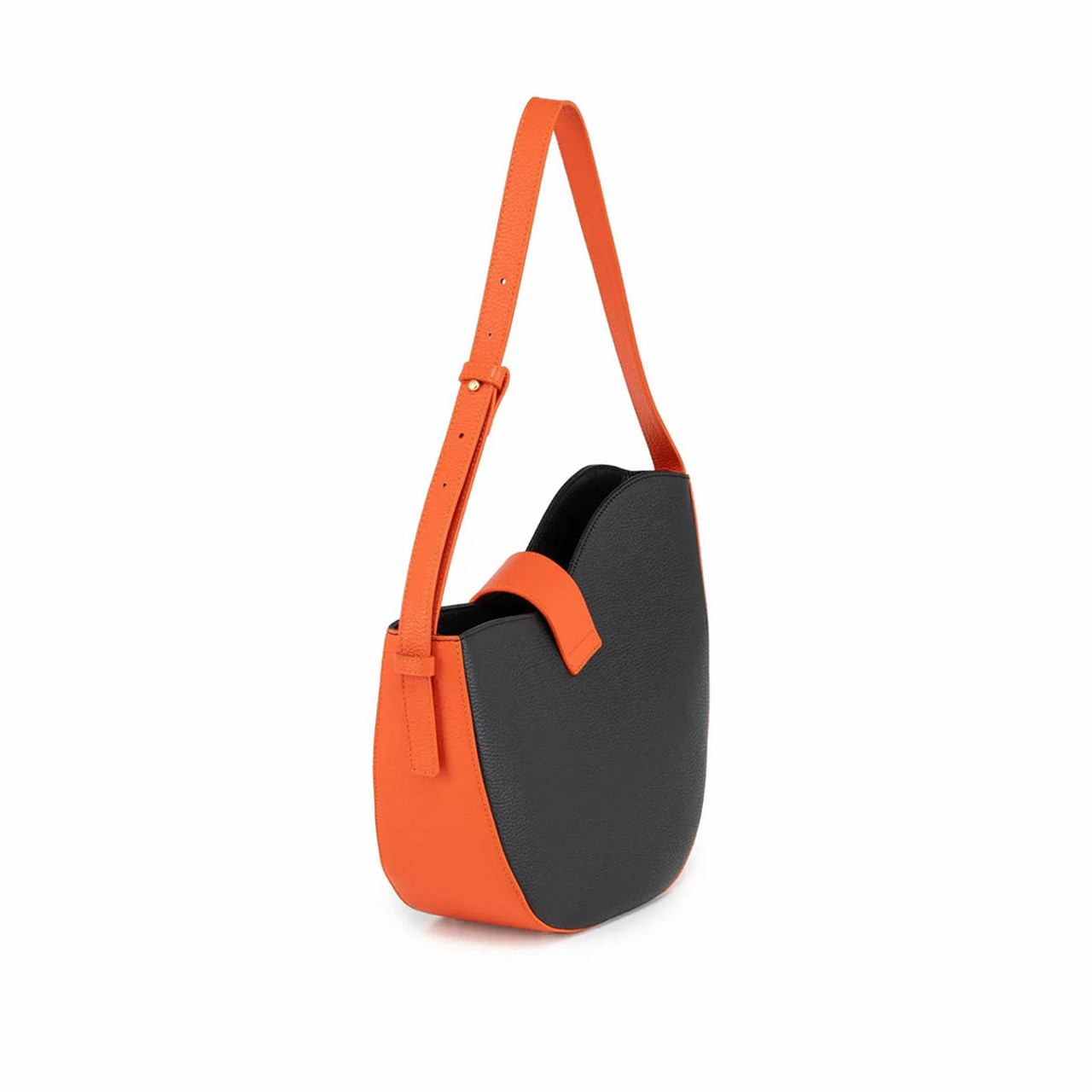 This stunning asymmetric shoulder bag has been handcrafted in luxurious pebble Italian leather. The Malala has an ergonomic shaped body, available with contrast coloured leather sides, strap and single top handle. It opens via a statement strap with gold ring details and hidden top zip. The internal single compartment is lined in logo fabric with side zipped pockets plus base studs.