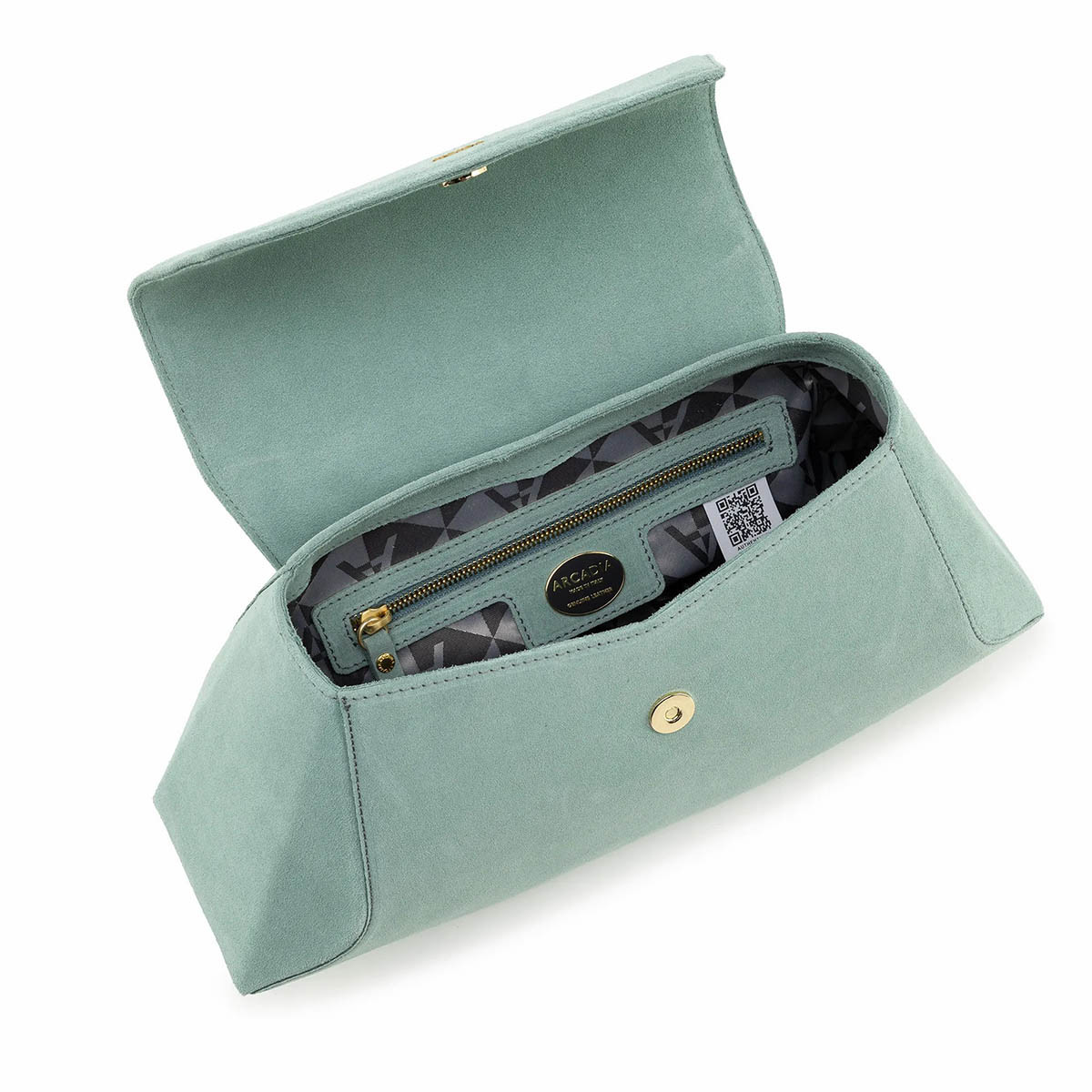 New season Siren large grab bag, hand crafted in Italy by Italian designers Arcadia.  The Siren is a retro style, geometric, structured bag made in luxurious suede, Italian leather. The single compartment is accessed by a flap over secured by a hidden magnetic lock. The inside is lined with Arcadia motif material and has a useful side zip pocket plus a detachable shoulder strap for added versatility and protective metal bottom feet.