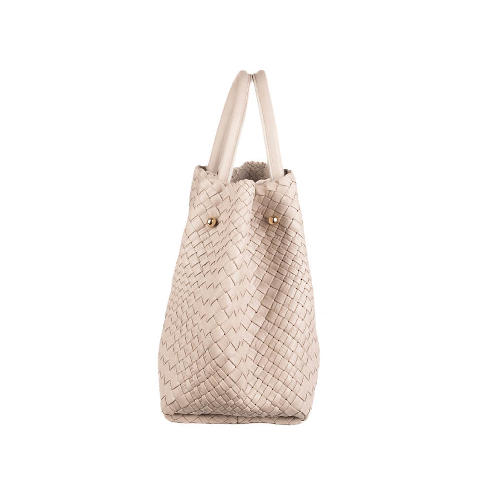 This unstructured large, soft bag is handmade in top quality Italian leather, that is hand woven into a weave pattern. The resulting geometric pattern takes many years of experience to perfect and involves no stitching. The soft leather is not only beautiful but is light weight too. The two top handle are plain leather and the body has stud detailing that creates gentle folds. There is an inner removable leather bag that opens via zip closure and allows the beauty of the weave to be seen from the inside too as a no stitch technique is used.
