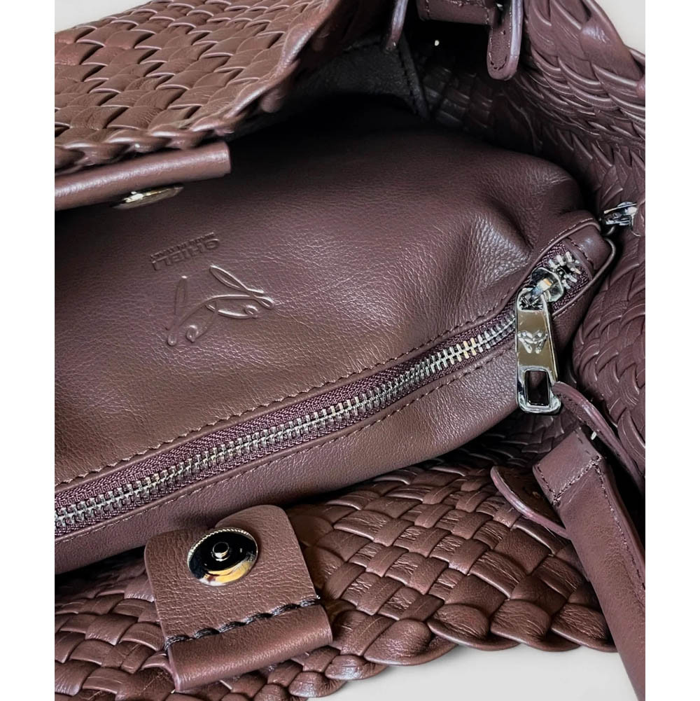 This gorgeous bag is made in luxury Italian leather, that is hand woven into a complex geometric weave that requires no stitching. The intrecciato pattern used takes many hours to perfect. The two top handle are made in plain leather and it has studs piercings on both sides below the handles to creates soft folds. The single compartment is unlined and has a separate, removable inner leather zipped purse.