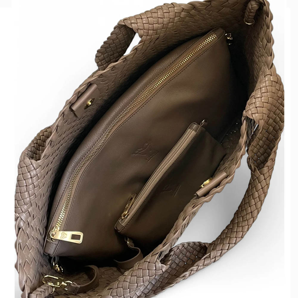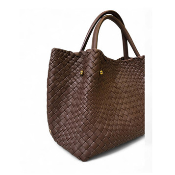 The Ghibli grab bag is made in luxury classic black, vegetable tanned Italian leather. It is painstakingly hand woven into a weave pattern called intrecciato and this technique takes many years to perfect and the resulting leather needs no stitching There are two top woven leather handle and the bag opens via a gold coloured magnetic snap closure to reveal a single un lined compartment, removable large central dividing zip compartment and smaller leather pouch, clutch. Plus a really useful detachable, leather shoulder strap.