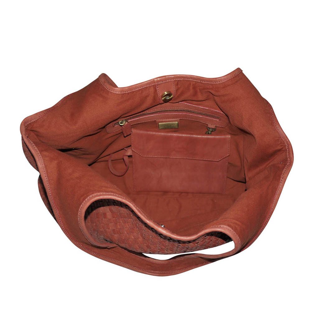 This exclusive large bag is handmade in quality Italian leather, hand woven, tanned and dyed then placed in wooden barrels and washed. The resulting very super soft leather is both gorgeous and very light. The broad top handles are plain and fits easily over the shoulder, it opens via a hidden inner magnetic snap closure button. The inside is lined in cotton and has a matching attached envelope purse, 1 side zip pocket, phone pouch.