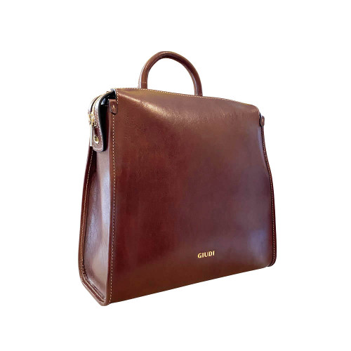 Classic updated backpack bag, handmade in Italian, in vegetable tanned leather using a traditional hand dyed technique. It has a top handle, top metal zip opening, long leather, adjustable shoulder strap, contrast stitching detail and embossed Giudi logo. The inside is plain lined with side zipped pockets.