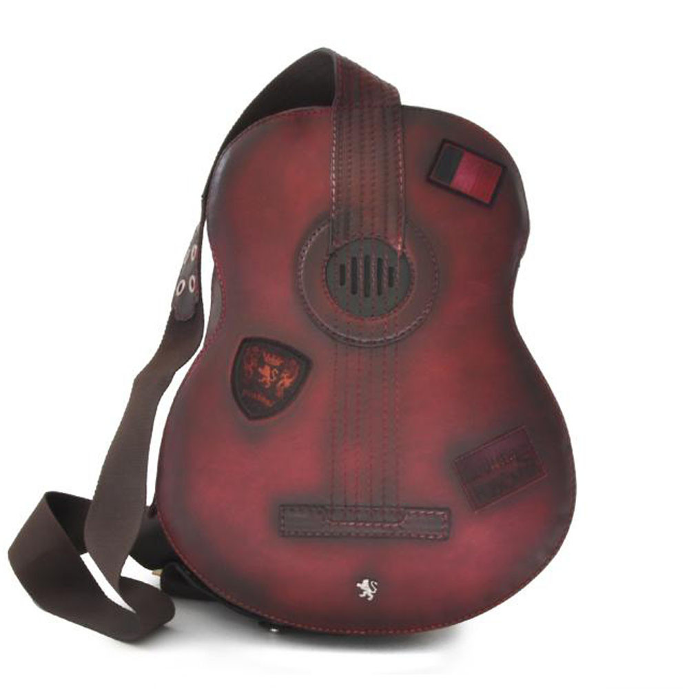 Musical inspired guitar shaped, designer backpack designed and made in Italy by craftsmen in Italian leather at Pratesi Italy. Since 1948 this family run business has been producing luxury, artisan made leather handbags, briefcases, wallets and accessories.